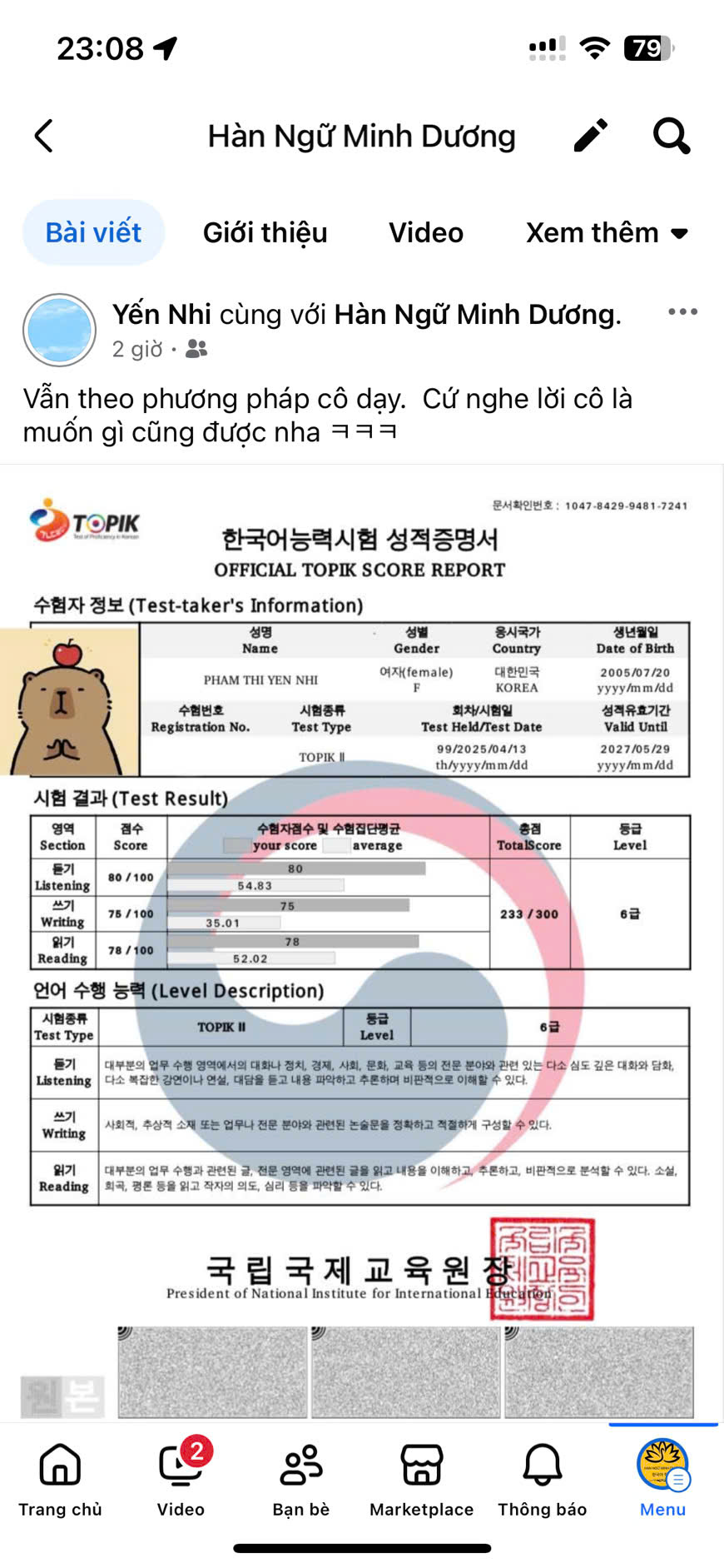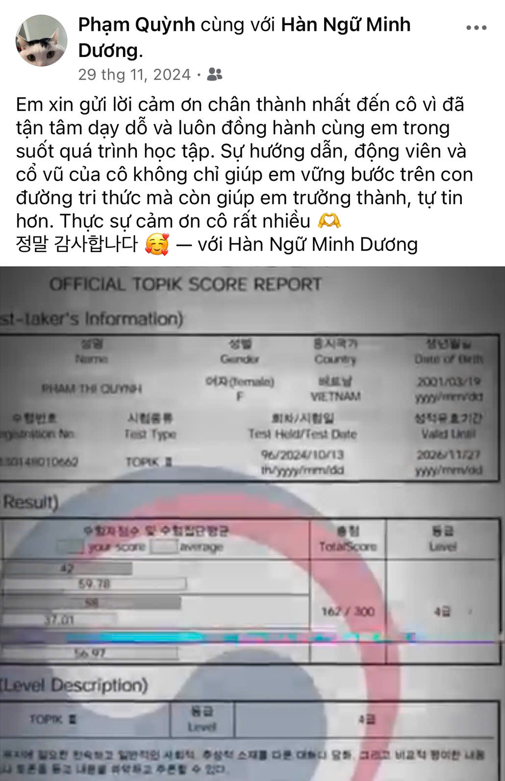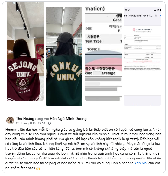 “Giá học phí hợp lý so với chất lượng giảng dạy. Giáo viên vui tính, tạo không khí lớp học thoải mái. Phần luyện nghe hơi ‘khó nhằn’ lúc đầu nhưng được luyện thường xuyên nên tiến bộ thấy rõ.”