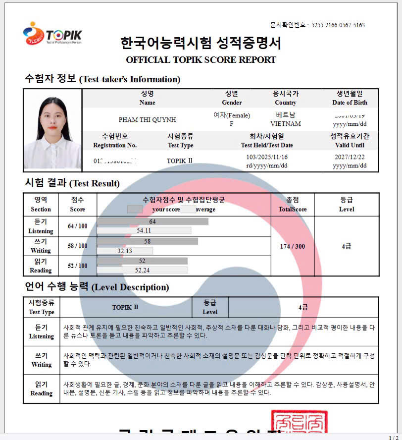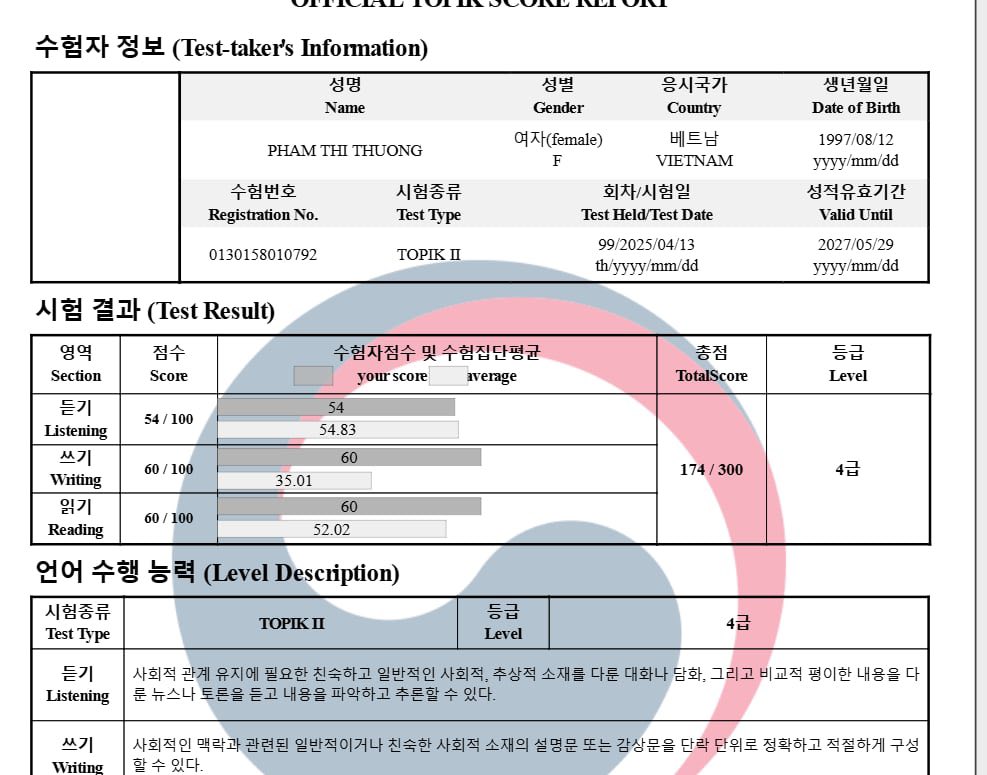 “Em đã nhiều lần từ bỏ tiếng Hàn nhưng cô Hàn Ngữ Minh Dương thì không từ bỏ em, em cảm ơn cô đã luôn bên cạnh động viên và giúp đỡ em không chỉ trong học tập mà còn cả trong công việc và cuộc sống. Lời cảm ơn này em nên nói với cô từ lâu rồi nhưng em phải đợi lúc gặt hái được kết quả mới không khiến cô thất vọng. Lần đầu thi Topik mà được kết quả như vậy em thật sự rất hạnh phúc, yêu cô ![]()